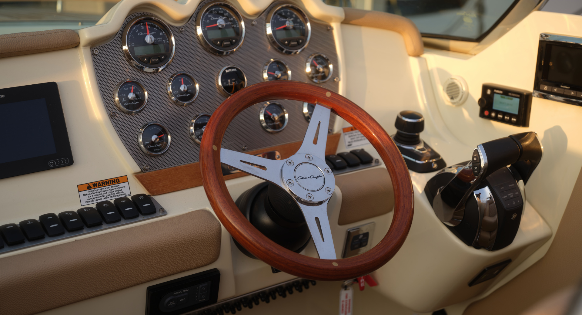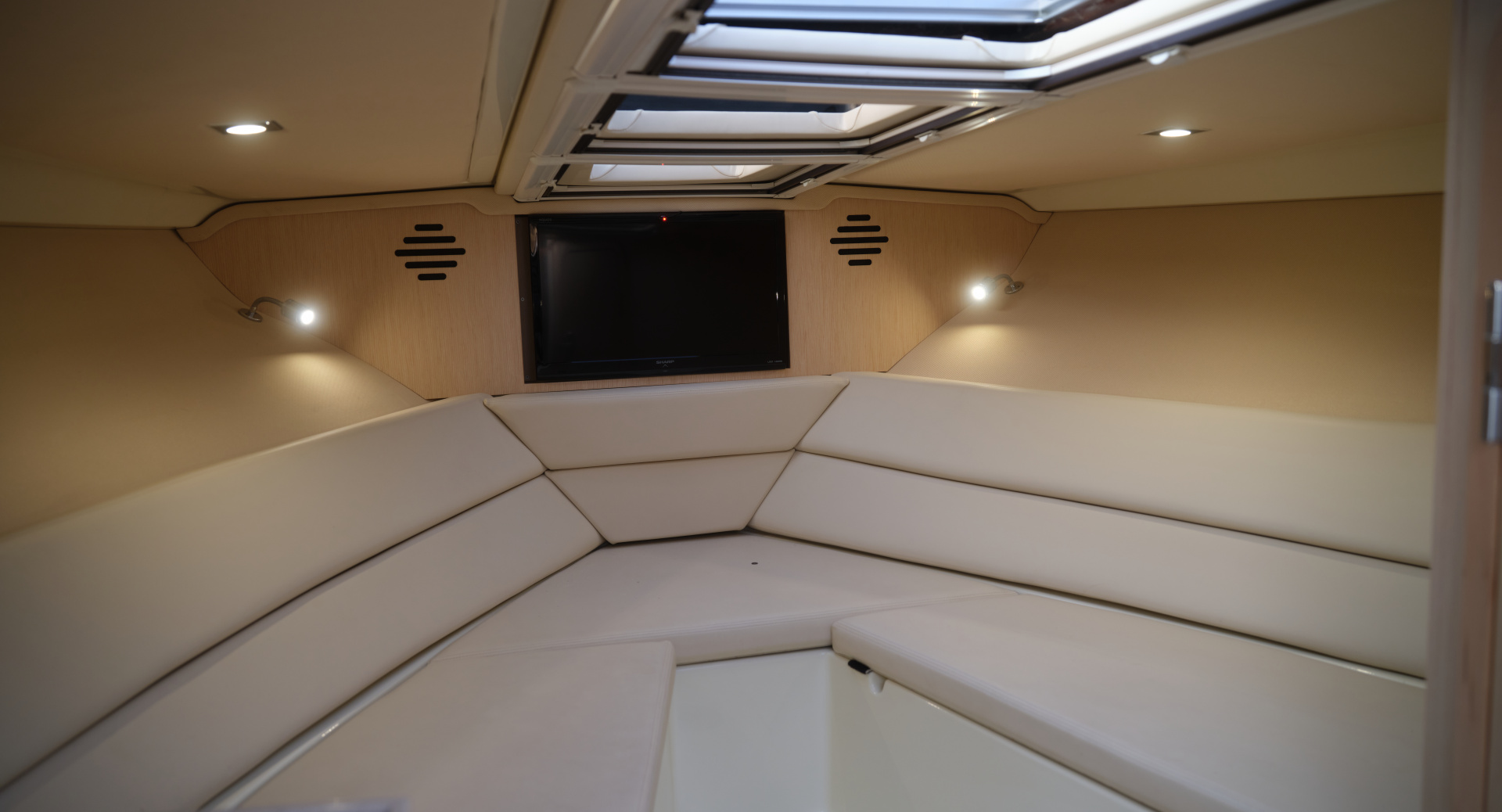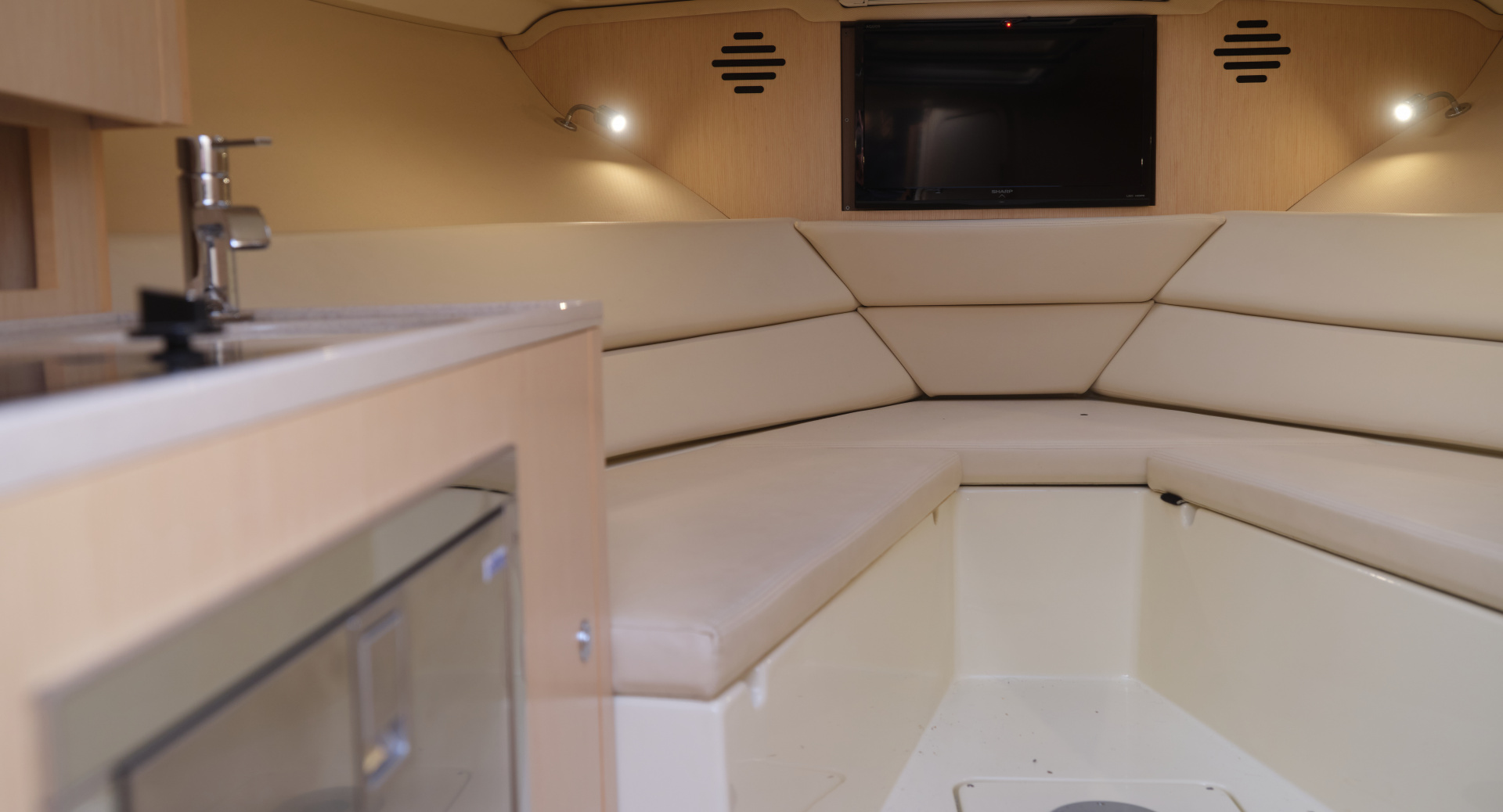 Chris-Craft Corsair 34 — это полноценная яхта, и не только благодаря общей длине, чуть превышающей 34 фута, но и благодаря великолепному комфорту на борту. Сохранив все фамильные черты внешности и компоновочные решения «Корсаров», дизайнеры верфи предоставили владельцу полноценную каюту под носовой палубой. По левому борту расположен камбуз с плитой и холодильником, а напротив него — довольно просторная туалетная комната с умывальником.